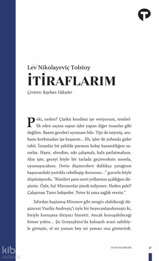 Hayatının Büyük Bir Kısmını Arayışla Ve Cevaplanmayan Sorularla Boğuşarak Geçiren Tolstoy, Çocukluğunda Öğretilenleri Geride Bırakmasıyla Başladığı Kendini Bulma Yolculuğunda, Varoluşunun Sebeplerini Bilim, Felsefe Ve Inanç Gibi Farklı Yerlerde Arıyor. Kimi Zaman Cevaplanmayan Sorularla, Tolstoy'un Yaşadığı Buhranla Karşı Karşıya Kalıyorsunuz.İtiraflarım'ın Her Bir Satırında Tolstoy'un Iç Dünyasına Yaptığı Yolculuğa Sahit Oluyorsunuz